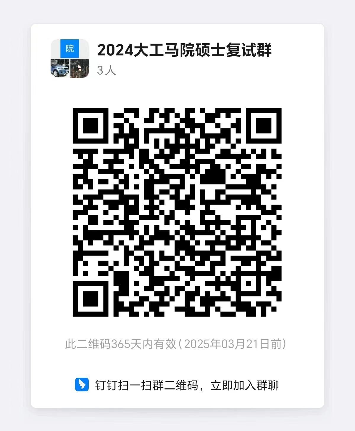 请参加复试的考生3月25日12:00前加入钉钉群(2024大工马院硕士复试群)群号6816 500 9867,申请入群时请写明考生姓名。(入群后请第一时间将群昵称修改为考生姓名)