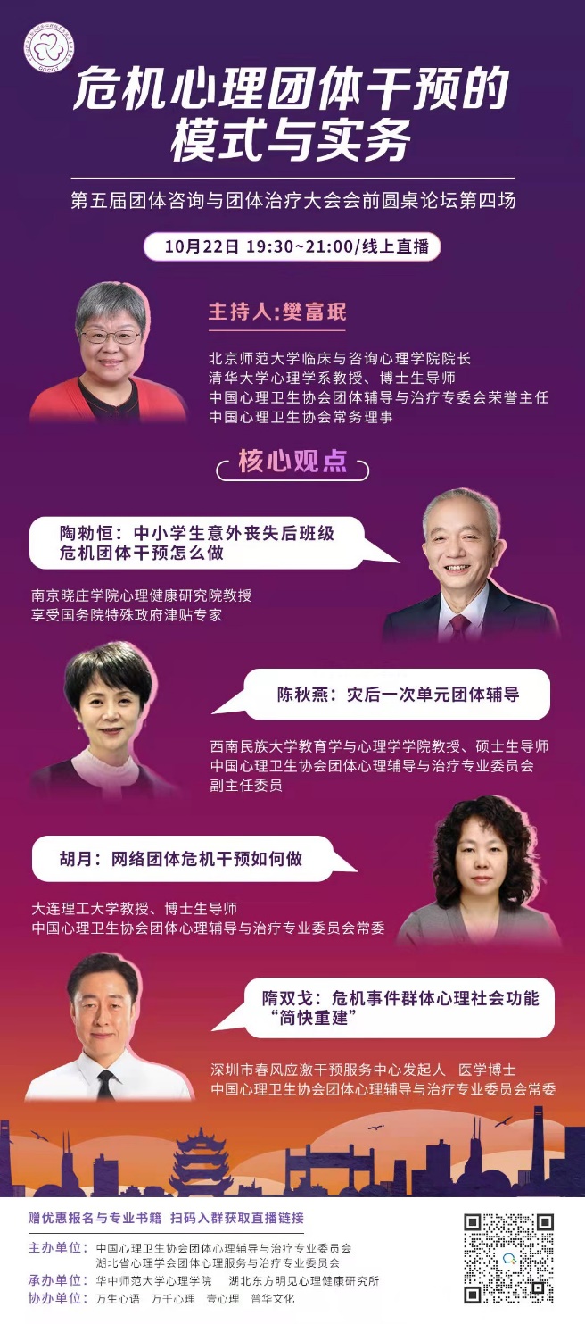 会前,必赢官网胡月教授受邀参加了于10月22日举办的《危机心理团体干预的模式与实务》主题网络圆桌论坛。该论坛由中国心理卫生协会团体辅导与治疗专委会荣誉主任樊富珉教授主持,南京晓庄学院心理健康研究院陶勑恒教授、中国心理卫生协会团体心理辅导与治疗专业委员会副主任委员陈秋燕教授及中国心理卫生协会团体心理辅导与治疗专业委员会常委隋双戈老师参加圆桌论坛。疫情下,开展网络团体危机干预十分必要。胡月教授围绕“网络团体危机干预如何做”问题发表观点。本次圆桌论坛吸引了各网络平台近16900+人观看学习交流。